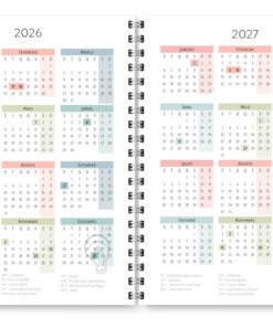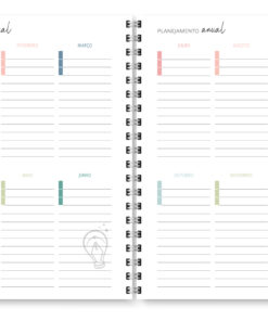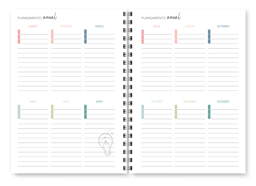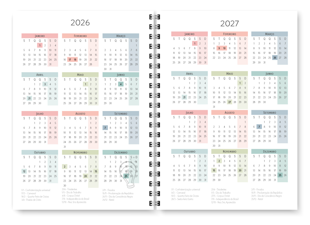 - Miolo com cores diversas – Meses com cores intercaladas (Rosa, Salmão, Azul, Azul esverdeado, Pistache e Verde)