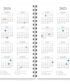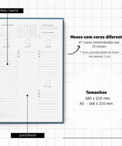 - Miolo com cores diversas – Meses com cores intercaladas (Rosa pacífico, Coral sereno, Verde, Roxo, Azul petróleo e Azul Celeste)